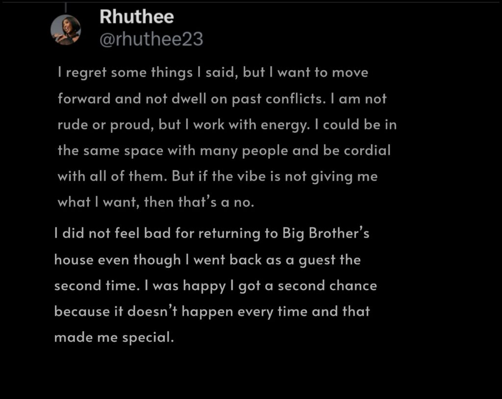 Reflecting on her experience, Ruthee admitted to having some tense moments with other housemates. She confessed