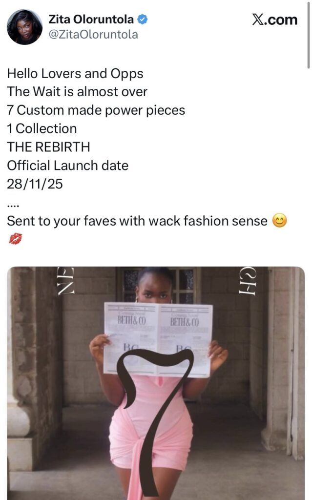 In a post shared via X.com, Zita revealed that her brand “THE REBIRTH” will officially launch on. However, it was her closing line that stirred controversy: