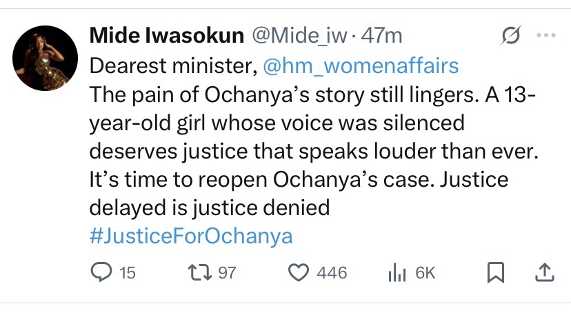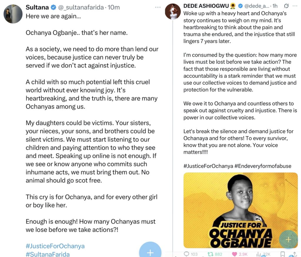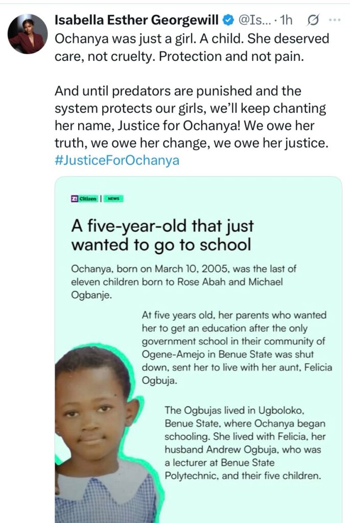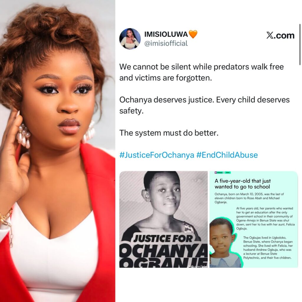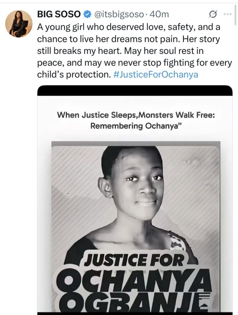 Several Big Brother Naija Season 10 housemates have joined thousands of Nigerians online in demanding justice for Ochanya Ogbanje, a young girl whose heartbreaking story of abuse and injustice continues to draw attention seven years later.