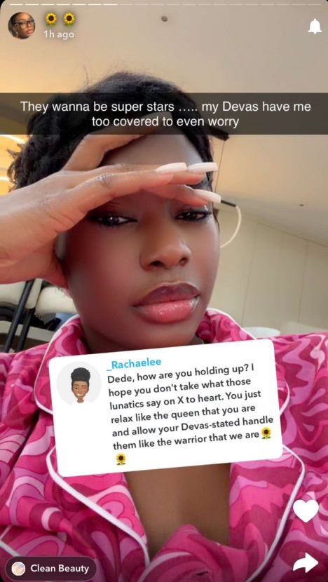 In the post, Dede appeared unbothered as she quoted, “They wanna be super stars… my Devas have me too covered to even worry.”