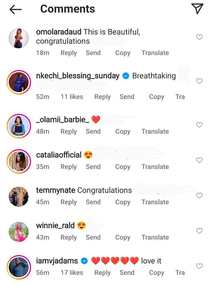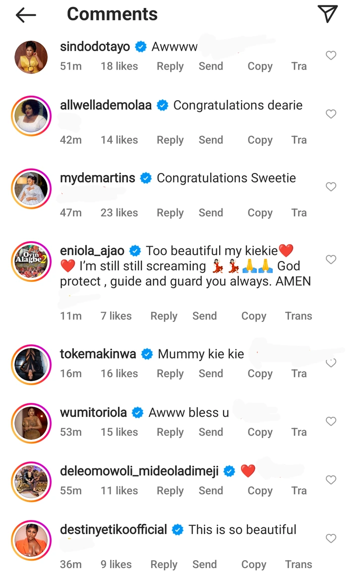 Popular Nollywood actress, Destiny Etiko, reacted after seeing her post by saying, “This is so beautiful.” Mide Martins, a Yoruba movie actress, also reacted by saying, “Congratulations, sweetie,” while actress Eniola Ajao also rejoiced with her by saying, “Too beautiful. I’m still screaming, “God protect, guide, and guard you always.” These reactions show that the actress is well-appreciated among her colleagues with their positive comments.