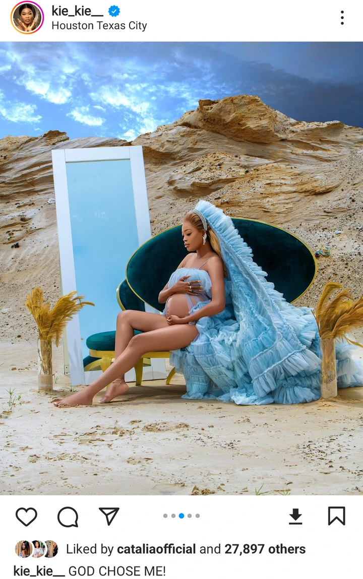 In her latest post, she came up with pictures of herself in a lovely costume while showing off her baby bump in a sitting position. She applied neatly done make-up to her face that matched the color of her skin. She showed up in a lovely hairdo that enhanced her beauty.
