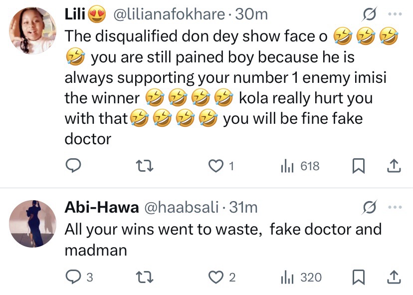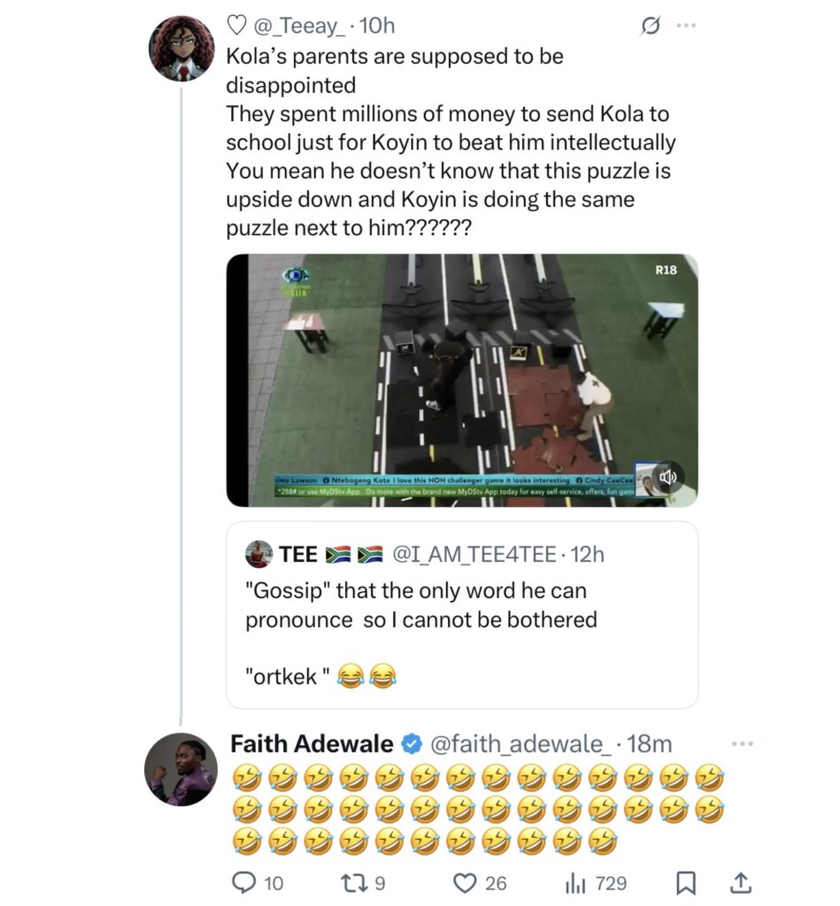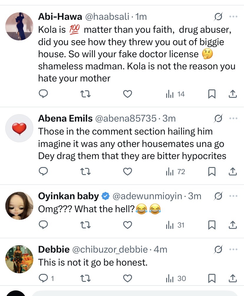 The drama started when a fan of Faith’s reposted an old clip of Kola from the house and wrote a harsh caption mocking both him and his family. Under the tweet, Faith dropped a laughing emoji a move that instantly sparked outrage across timelines.