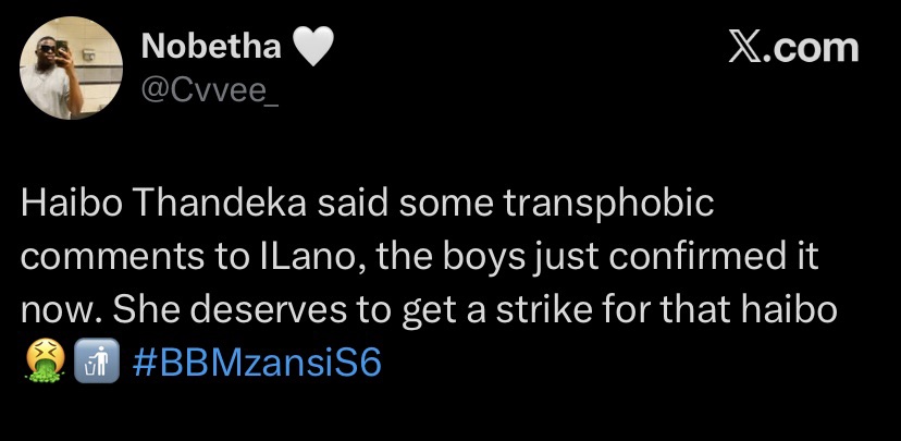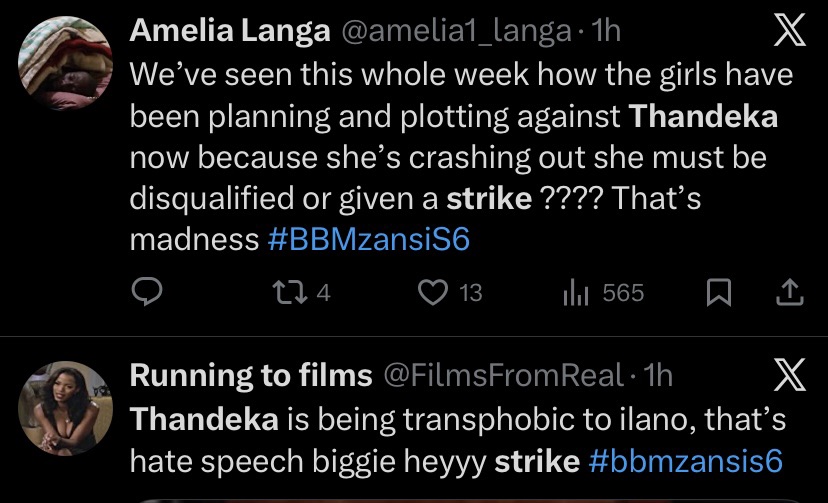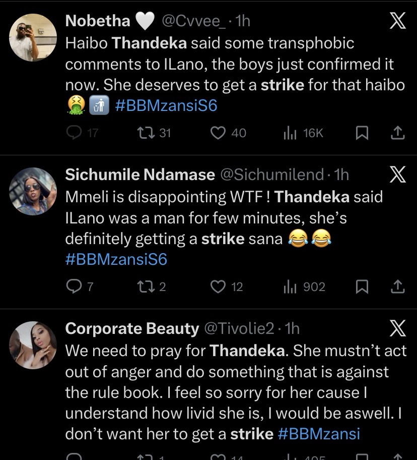 BBMzansi fans are once again locked in heated discussions after Thandeka made a controversial comment towards Ilano, a moment that many viewers believe crossed the line. The remark, which quickly made the rounds online, has triggered strong reactions, with some fans calling for disciplinary action.