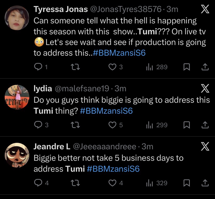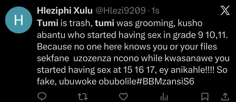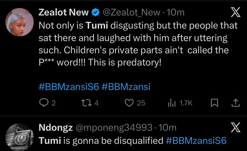BBMzansi viewers are calling for serious consequences after Tumi made a statement involving a minor, a moment that has quickly become one of the most controversial topics of the season.