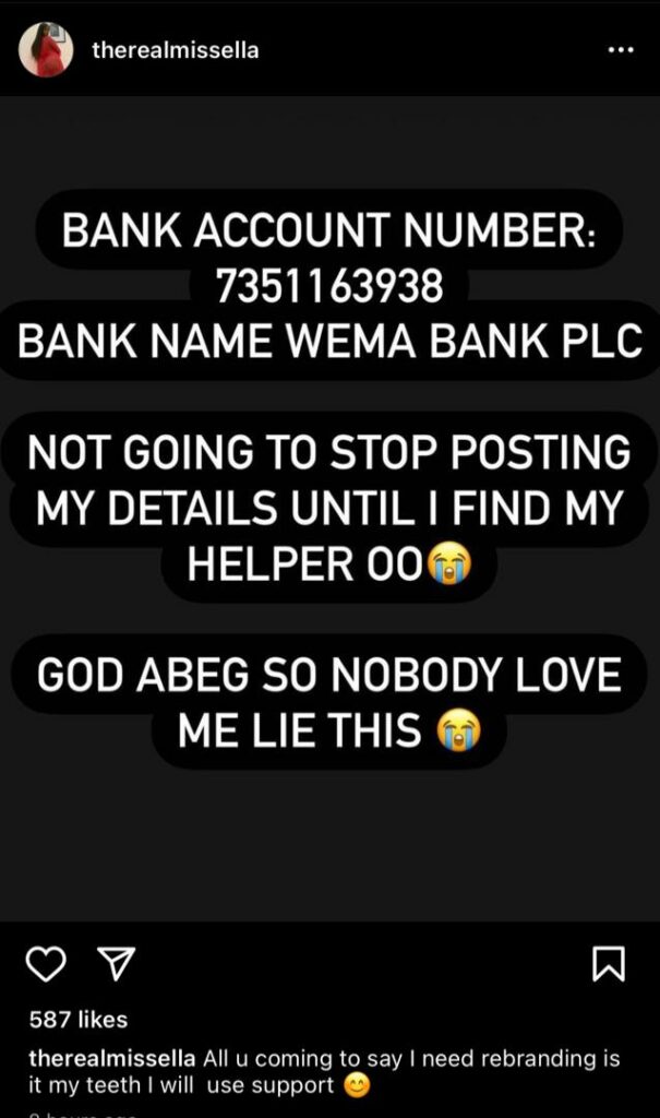 In a post, Ella shared her bank details while insisting on keeping it up until she gets the help she deserves.