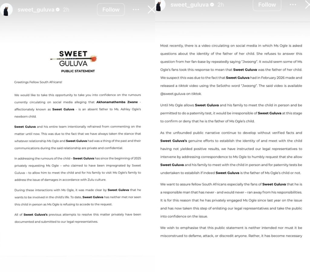 Reality TV personality Sweet Guluva has broken his silence following circulating allegations labeling him an “absent father.” In a detailed public statement, Sweet Guluva addressed the claims head-on and revealed that he has formally requested a paternity test from Ashley to resolve the matter.