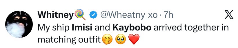 Videos and photos from the glamorous event quickly made the rounds online, showing Imisi and Kaybobo arriving side by side, clearly comfortable in each other’s company.