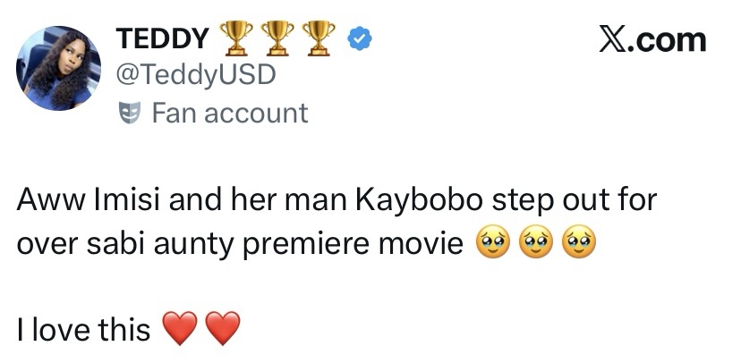 Imisi and Kaybobo have set tongues wagging after they stepped out together in striking matching outfits at the premiere of actress Toyin Abraham’s highly anticipated movie, Oversabi Aunty. The pair’s coordinated appearance immediately caught fans’ attention, with many questioning if there is more than friendship between them.