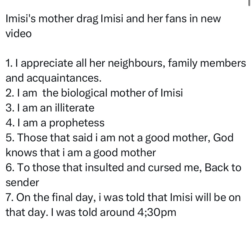 The mother of BBNaija Season 10 winner, Imisi Opeyemi Ayanwale, has finally shared her side of the story following weeks of online criticism and harsh comments directed at her.