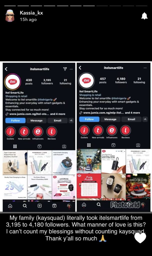 Kassia, who serves as a brand influencer for Itel, took to social media to appreciate the efforts of her supporters.