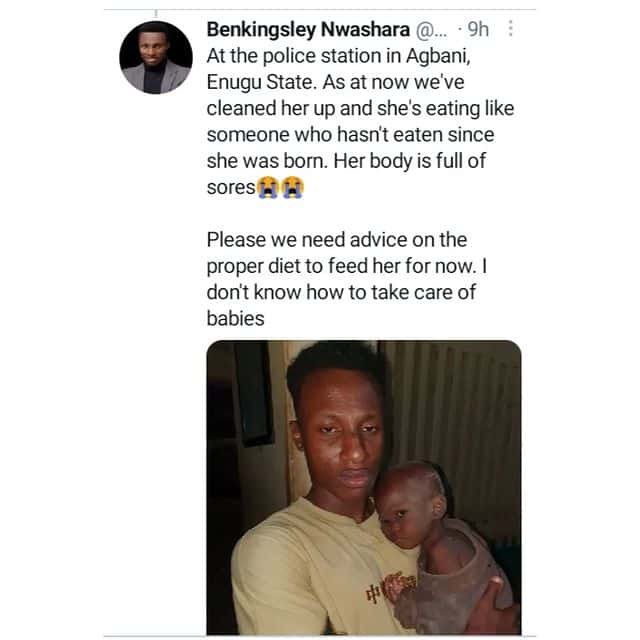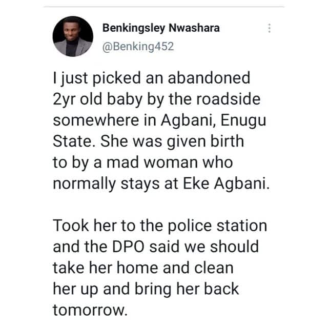 The young man identified as Benkingsley Nwashara on Twitter revealed in June that he found an abandoned 2-year-old baby by the roadside in Enugu which was birthed by a mad woman.