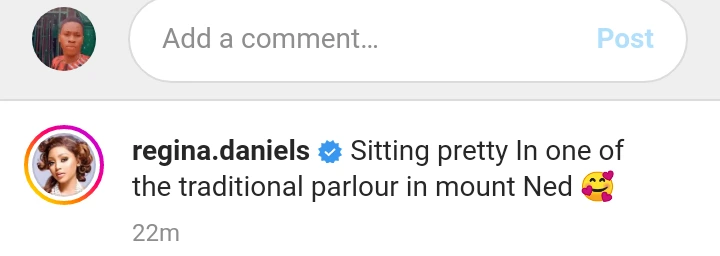 After Regina Daniels shared the photos, she backed it up with a caption that reads, “Sitting pretty In one of the traditional parlour in mount Ned.”