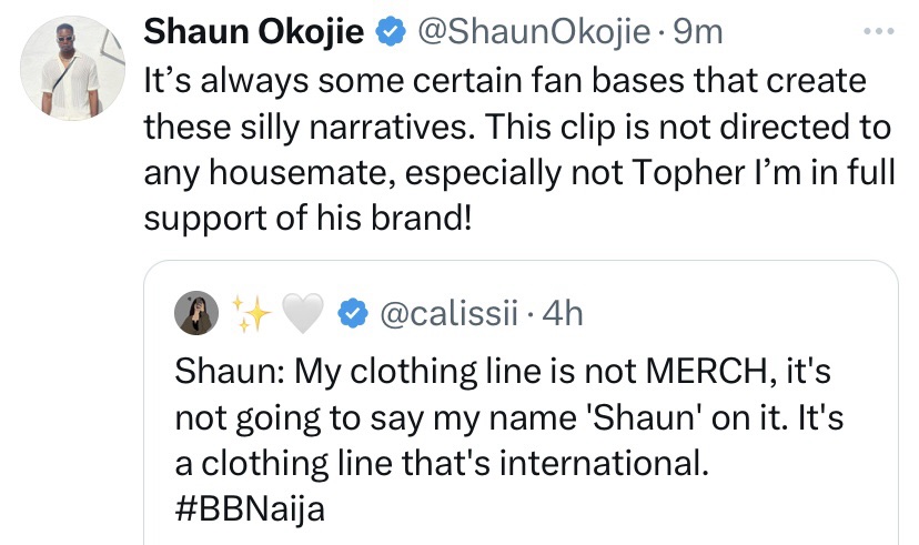 Shaun, the popular BBNaija Season 9 contestant, recently found himself at the center of fan drama after a clip from his social media went viral. In the video, some fans speculated that Shaun was subtly throwing shade at fellow housemate Topher, leading to heated discussions among fan bases. However, Shaun quickly shut down these rumors, taking to his platform to clear the air.