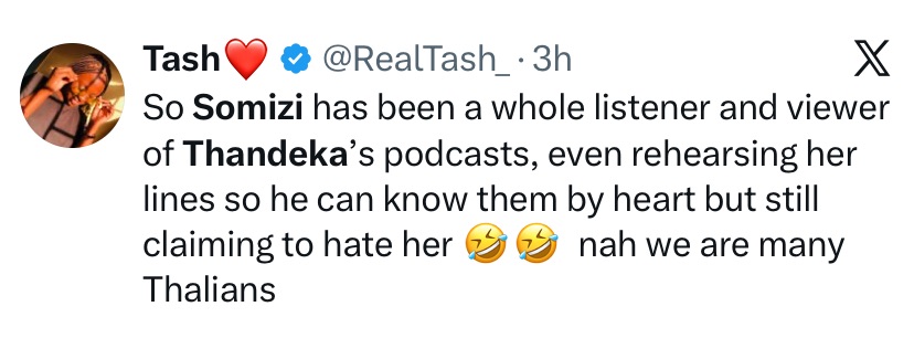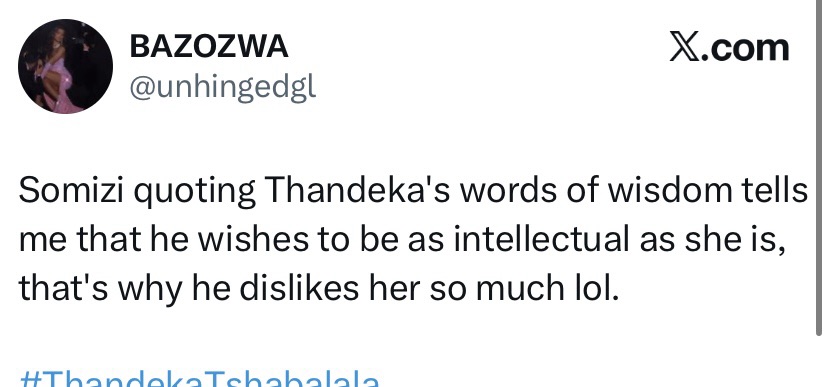 During the broadcast, Somizi quoted Thandeka while discussing trending topics from the recently concluded season. However, the tone and context of the reference did not sit well with a section of Thandeka’s supporters, who felt the quote was used in a way that mocked or undermined her.