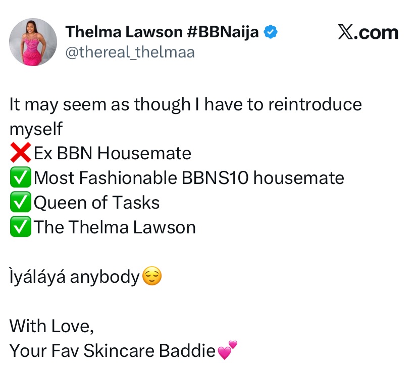 BBNaija star Thelma Lawson has responded to online backlash after boldly declaring herself “the most fashionable housemate” of the season. The reality star made the statement during a recent Instagram Q&A session, where she praised her unique sense of style and confidence.