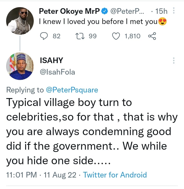 Popular singer, Peter Okoye aka “Mr P” has reacted after a Twitter user trolled him for no apparent reason.