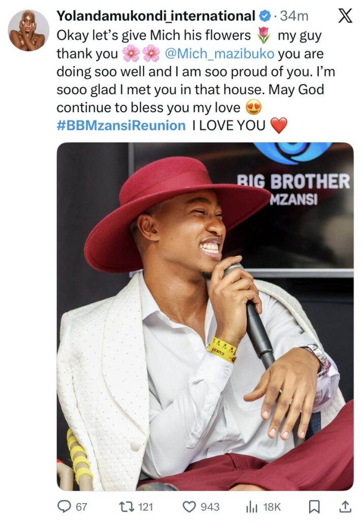 “Okay let’s give Mich his flowers,” Yolanda wrote, expressing gratitude for their bond and how far he has come since leaving the house.